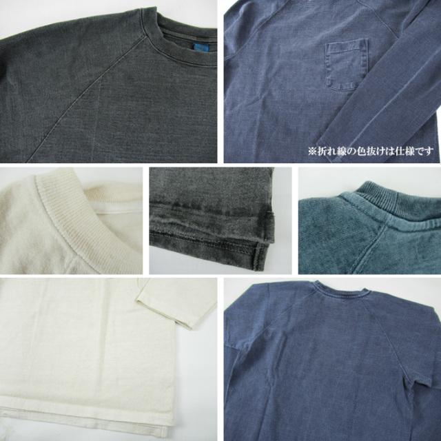 | ヘヴィーウェイトラグランTシャツの長袖バージョンです。サイドスリットに後ろ丈が長めのスタイル。厚手の生地特有の凹凸に色の濃淡が際立つPigment Dye(顔料染め)カラーは、他にはない味のある表情が特徴で、洗濯の度に表面から徐々に色褪せしさらに風合いを増していくので、長く愛用するほどに上質なビンテージ品のように印象が変わっていきます。丈夫で長年着続けられるTシャツだけに、愛着を持って自分でビンテージの表情に育て上げていくのが醍醐味となります。 |