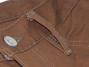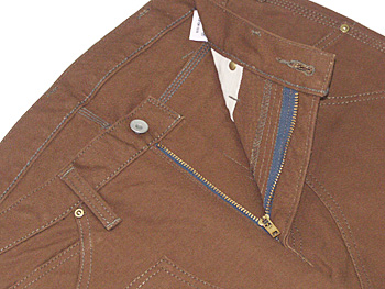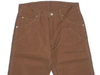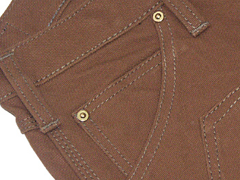 | トップブロックのバックビュー。ダブルストレートステッチが入ったワークアイテムらしい角型バックポケット。 | ベルトラインにピスネームが付きます。 |
