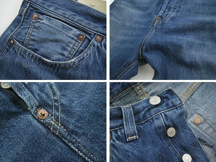 | 仕様 | ・ボタンフライ ・シンチバック ・隠しリベット ・片側BIG”E”RED TAB ・一歩針アーキュエットステッチ ・赤耳セルビッジデニム ・トルコ製 |