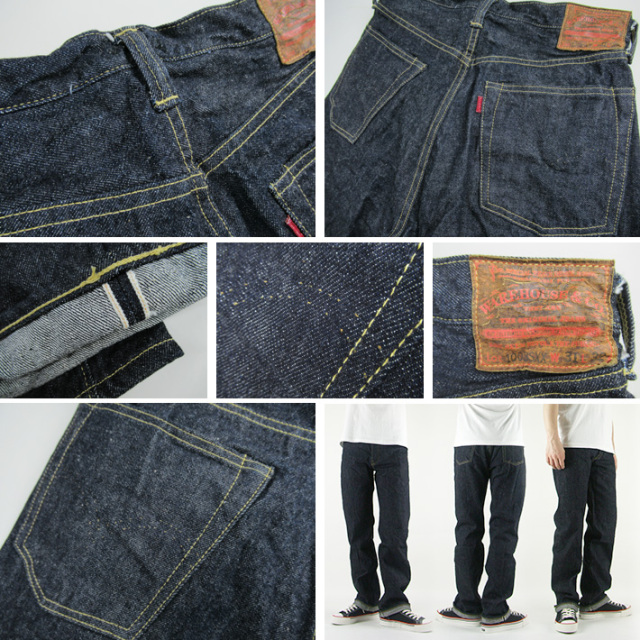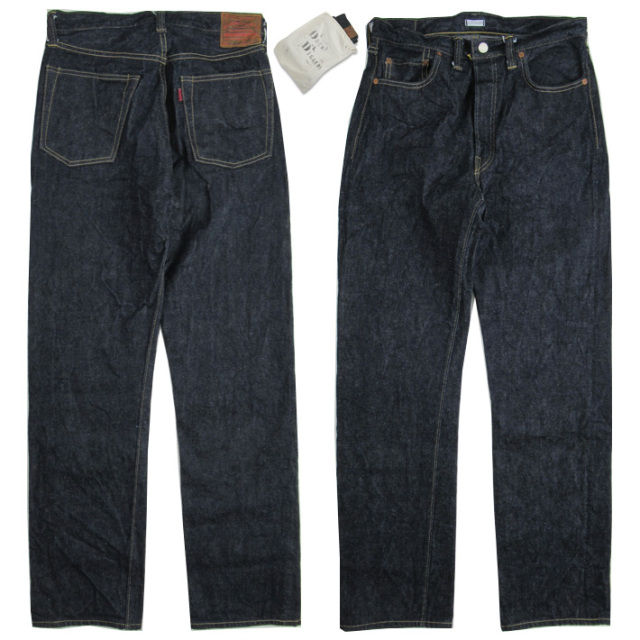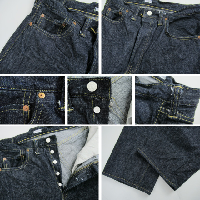 | 第二次世界大戦の影響で簡素化された大戦モデルです。そのためバックポケットのステッチはペンキ仕様、シンプルなリベット、各部の縫製の粗さも当時を再現しています。デニム生地は今回新たにデッドストックの生地を分析、タテ6.7番×ヨコ6.6番の糸で織り上げた14オンス程の新開発デニムです。シルエットは幾分ゆったり目のストレートです。(※モデルスタッフ身長170cm体重63kgで31インチを着用。) |